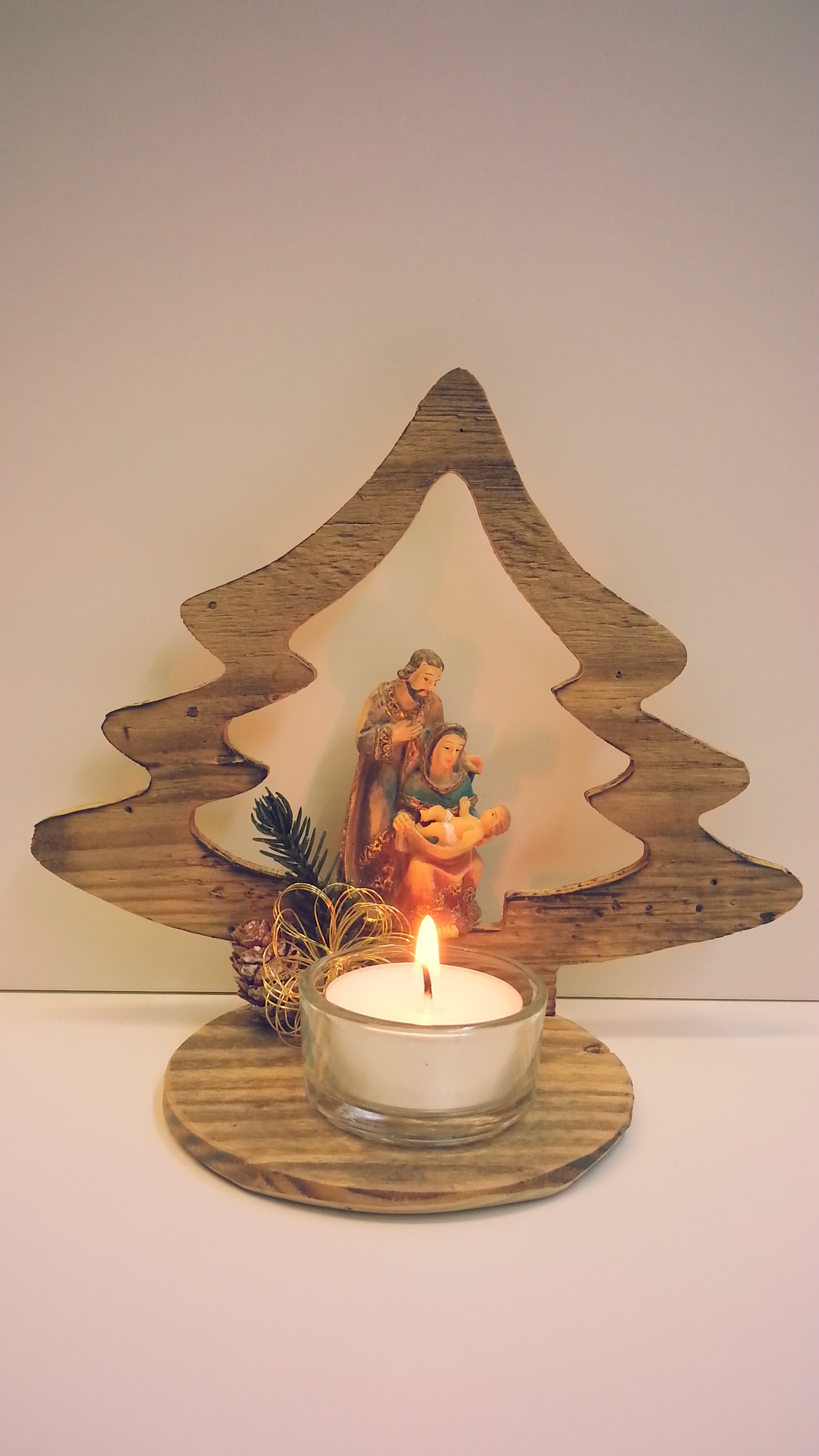 Altholzbaum für Teelicht mit Heiliger Familie und Floristik