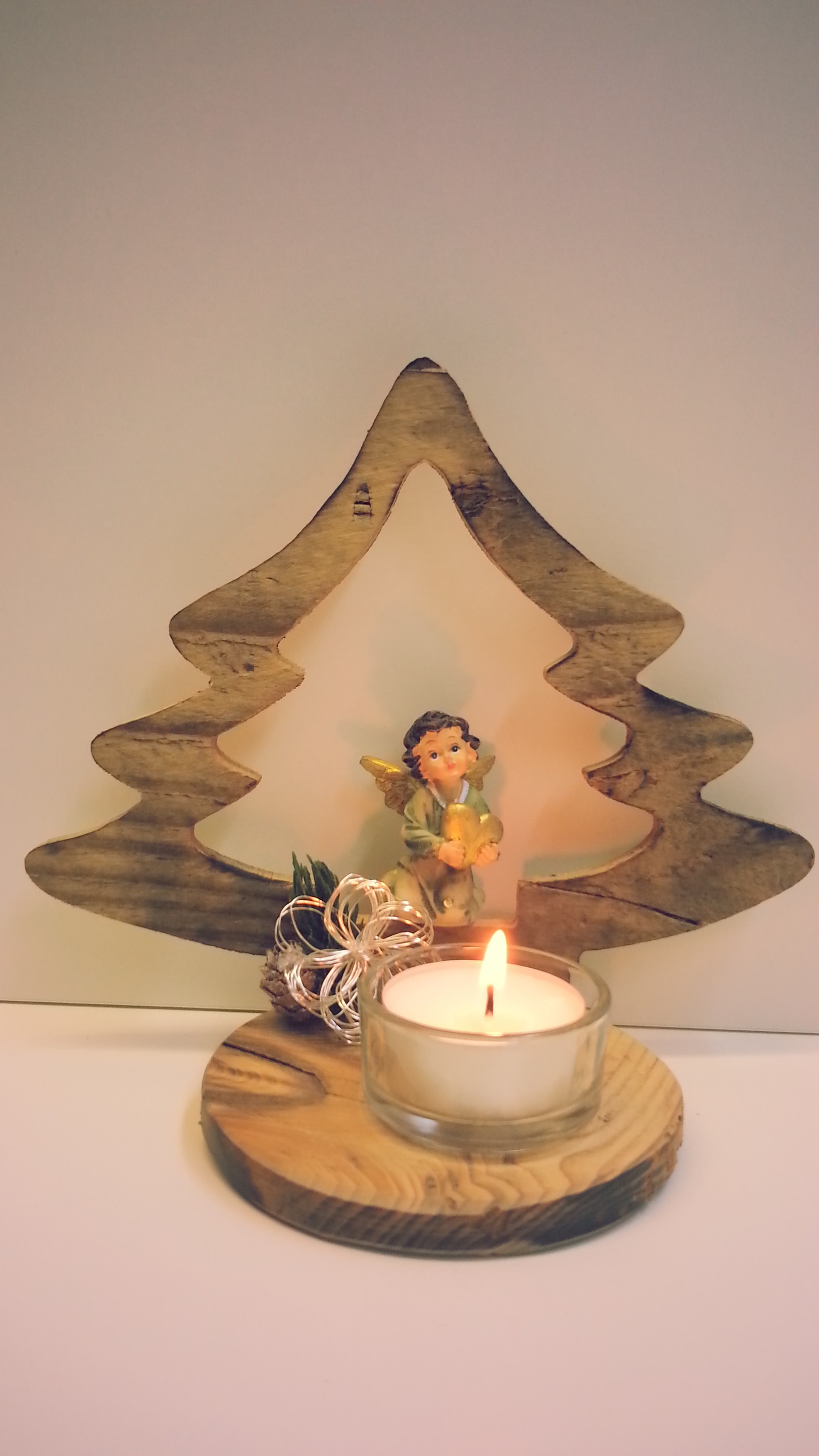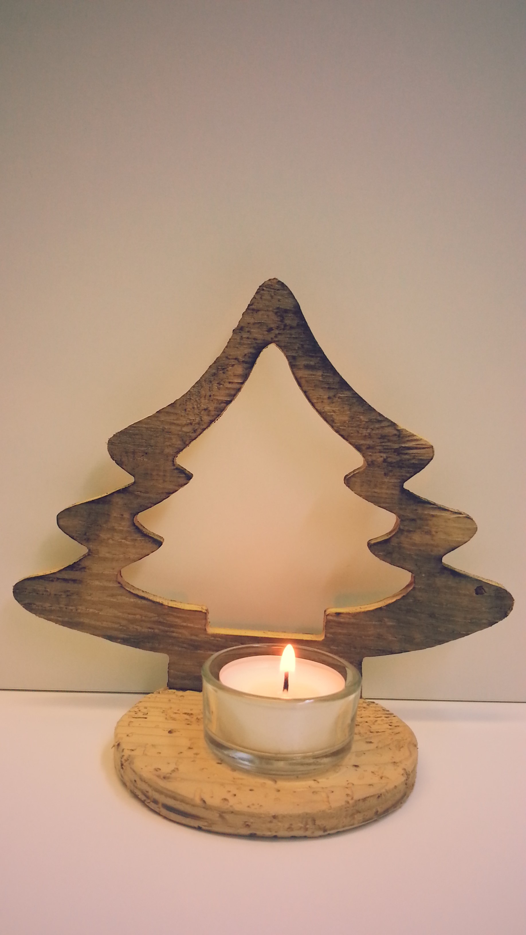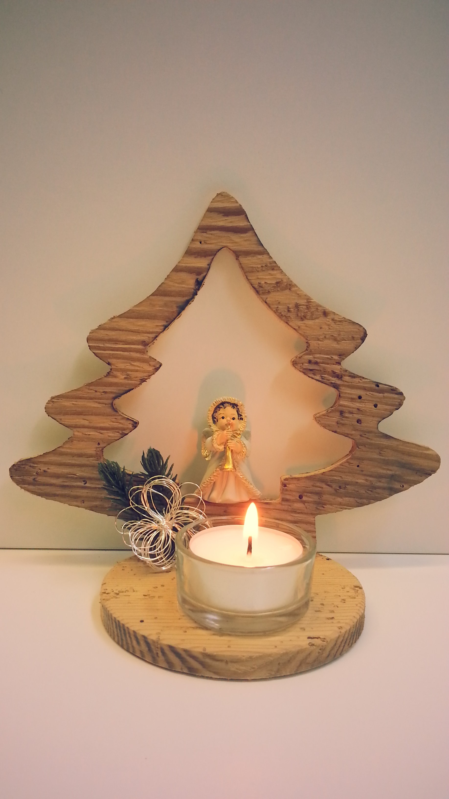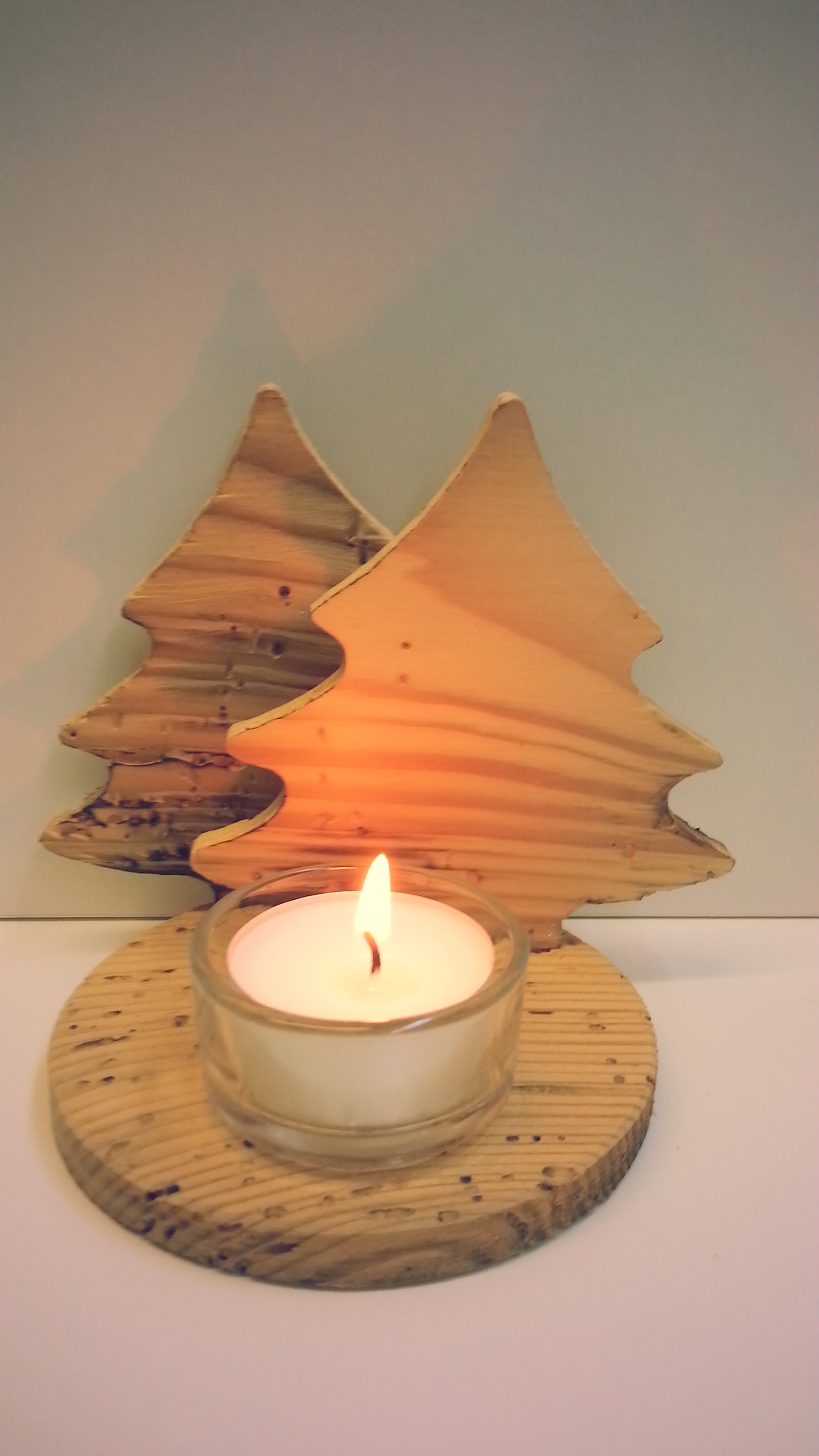 Teelichthalter mit dekorativen Tannenbaum und Altholzsockel