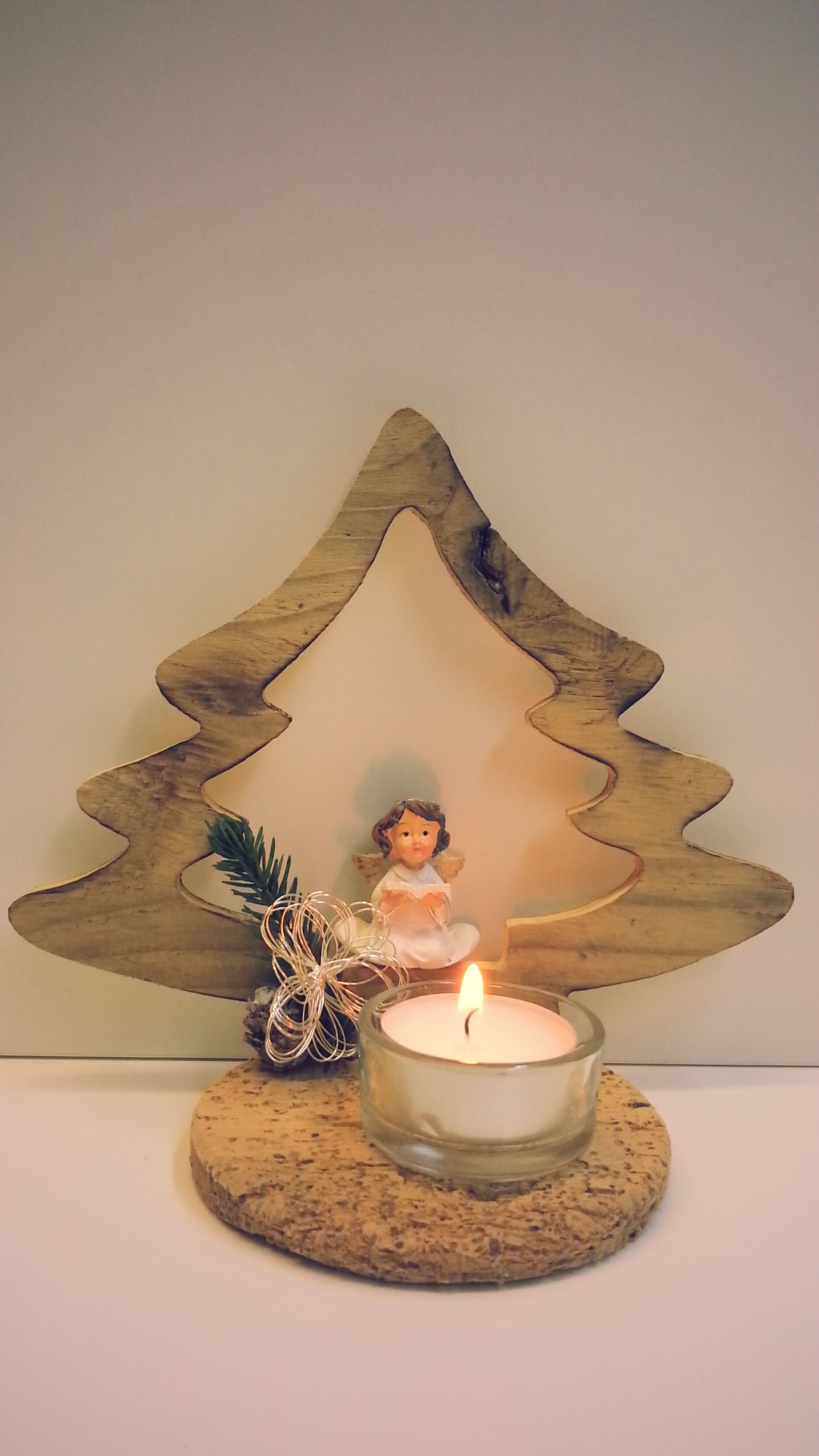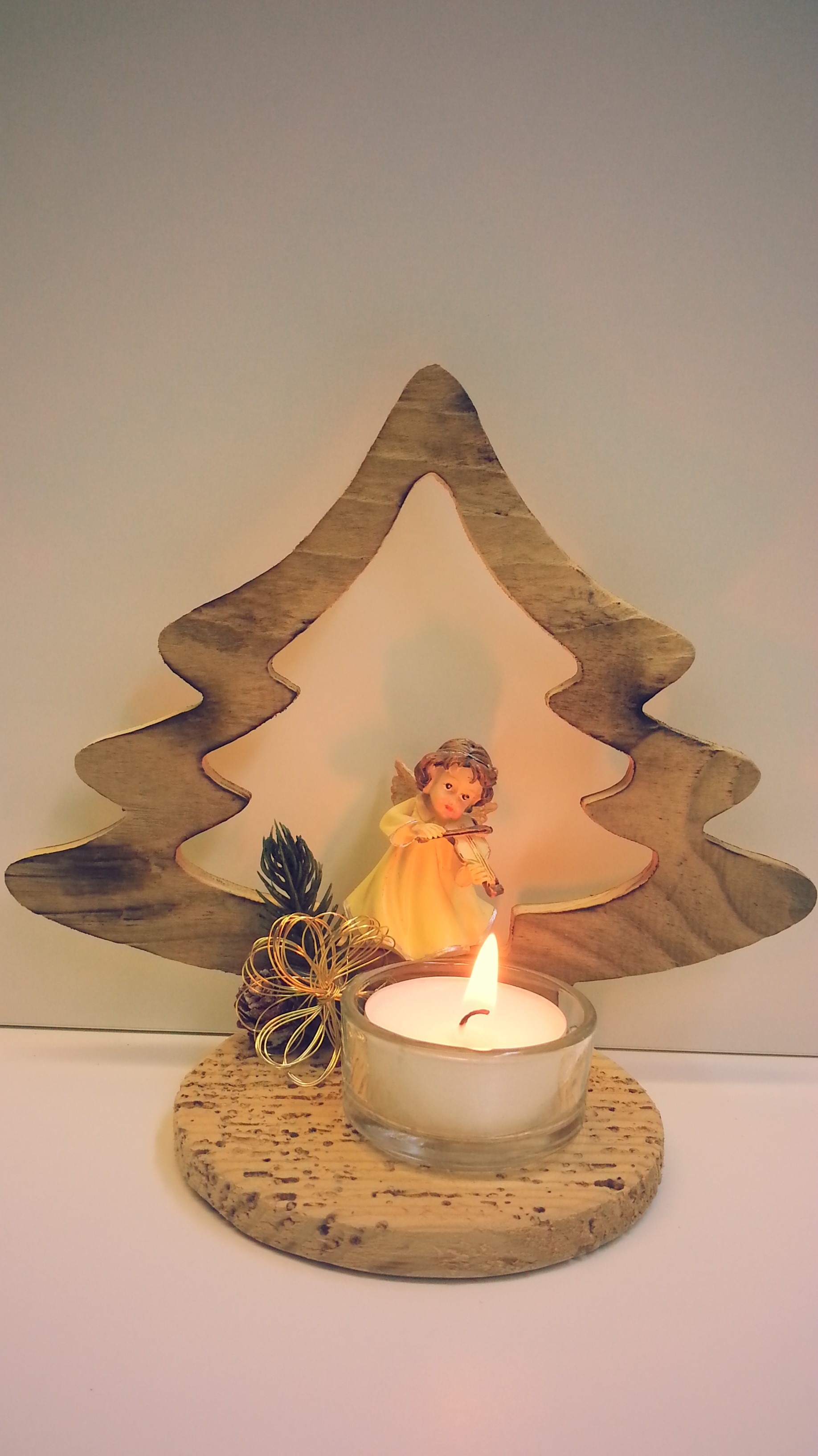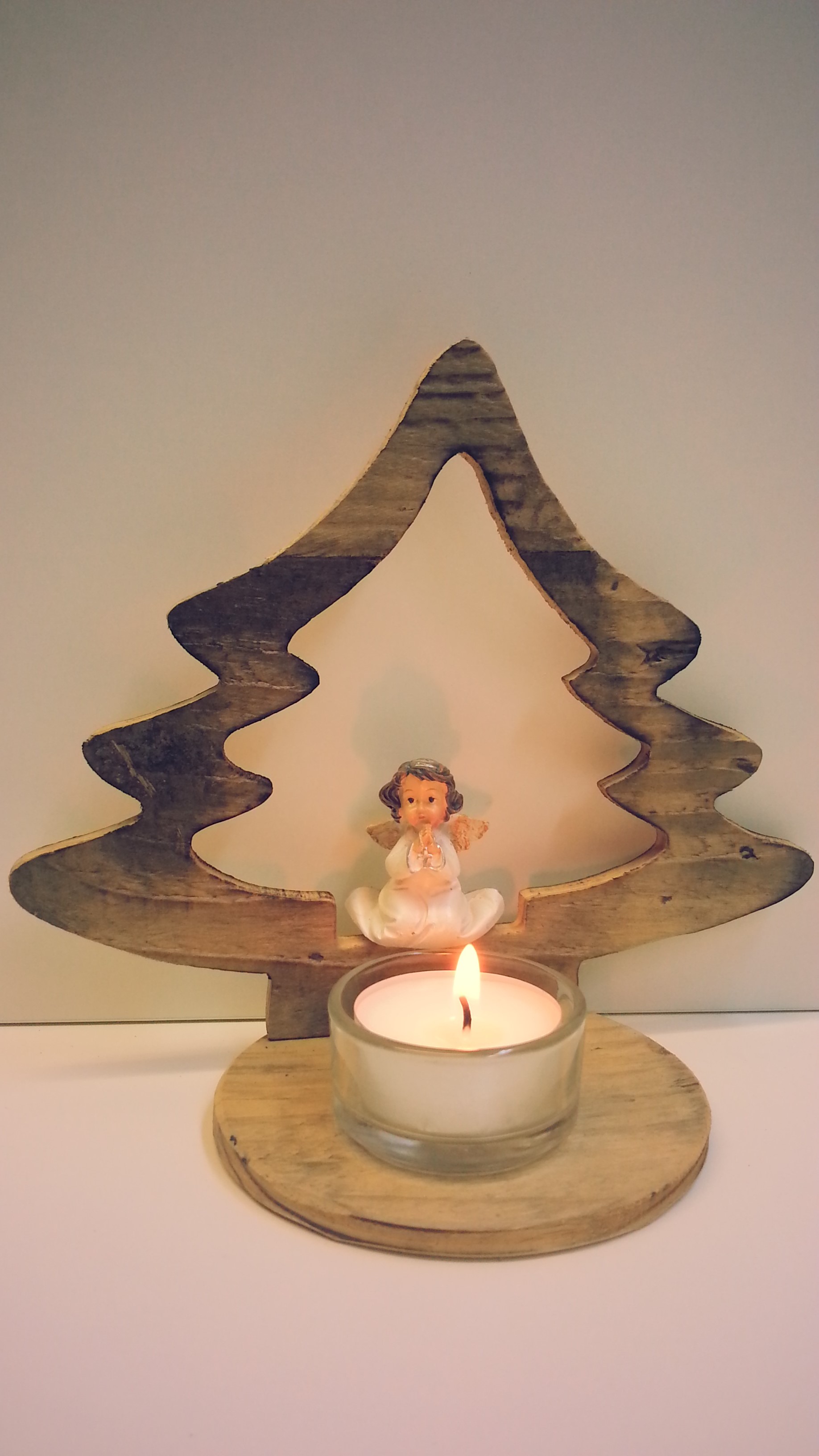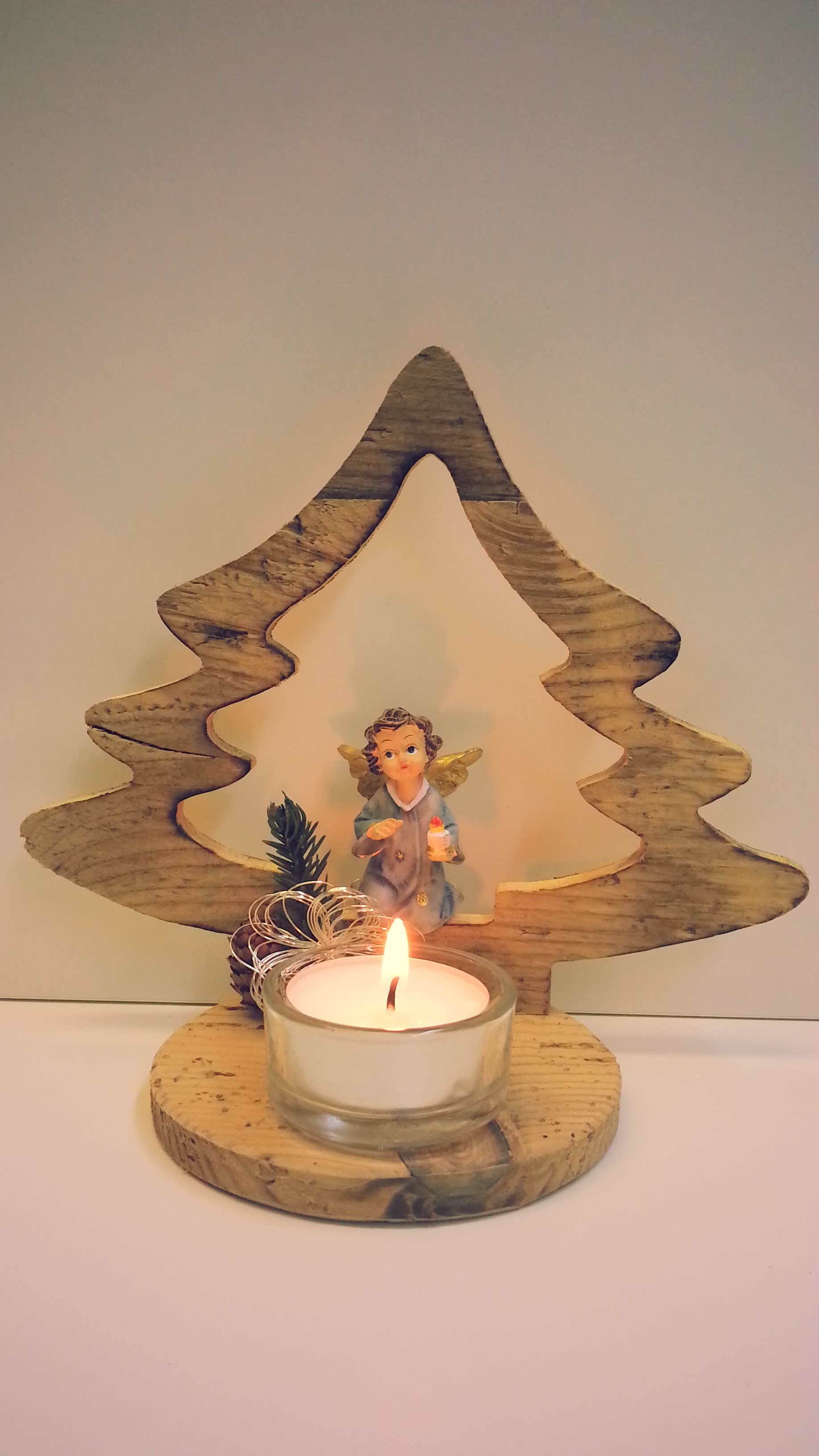 Teelichthalter mit dekorativen Tannenbaum und Altholzsockel