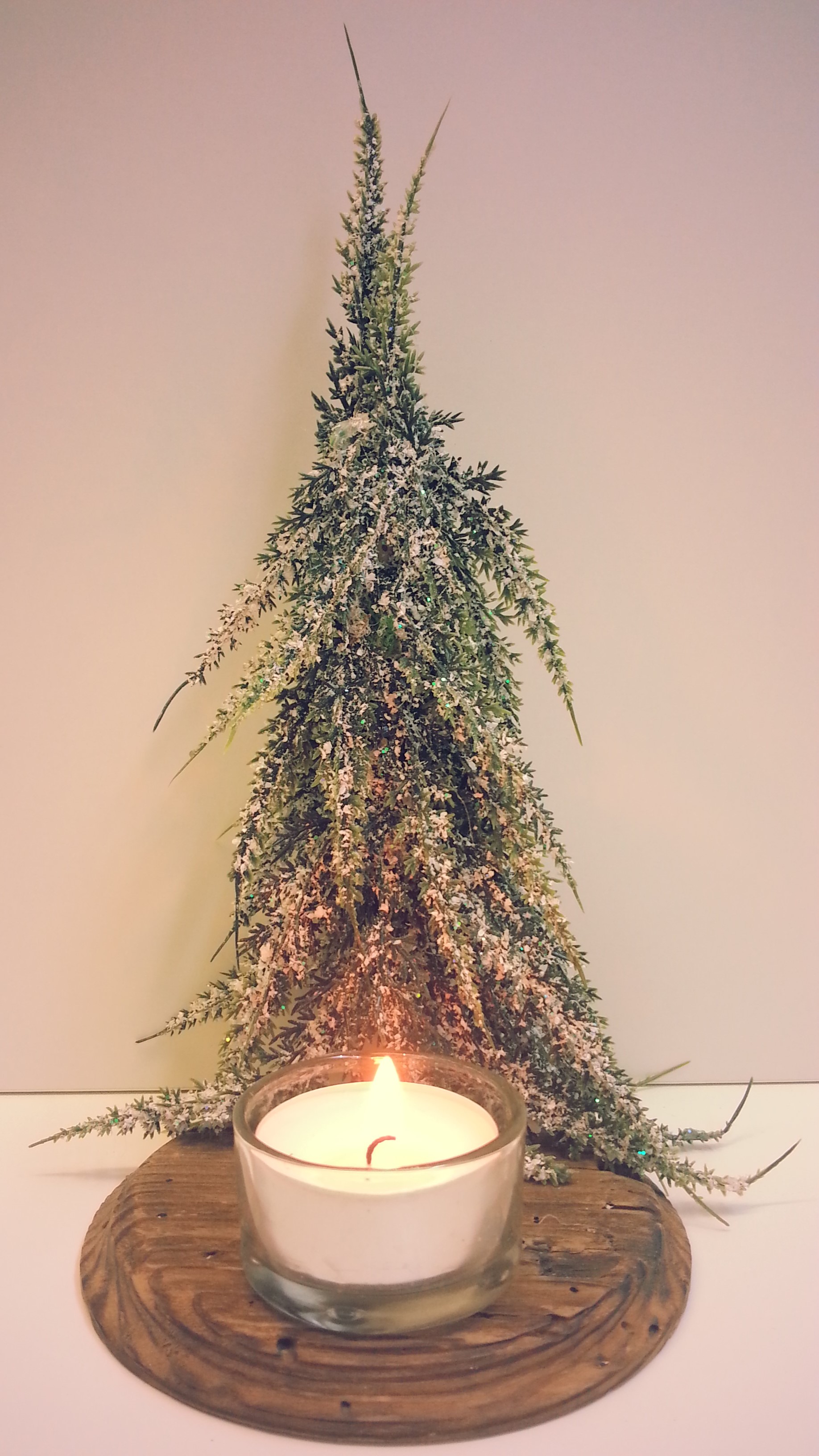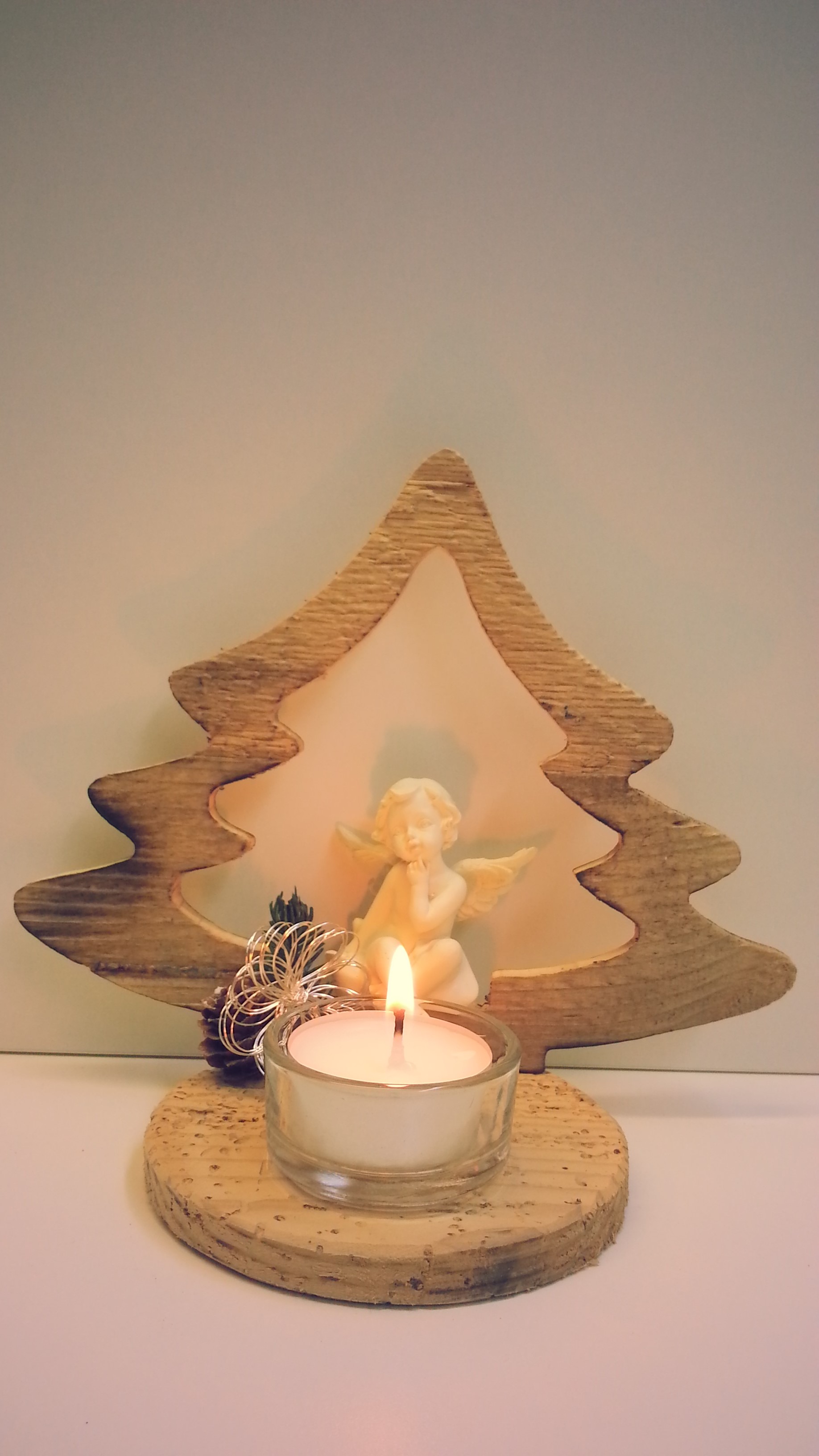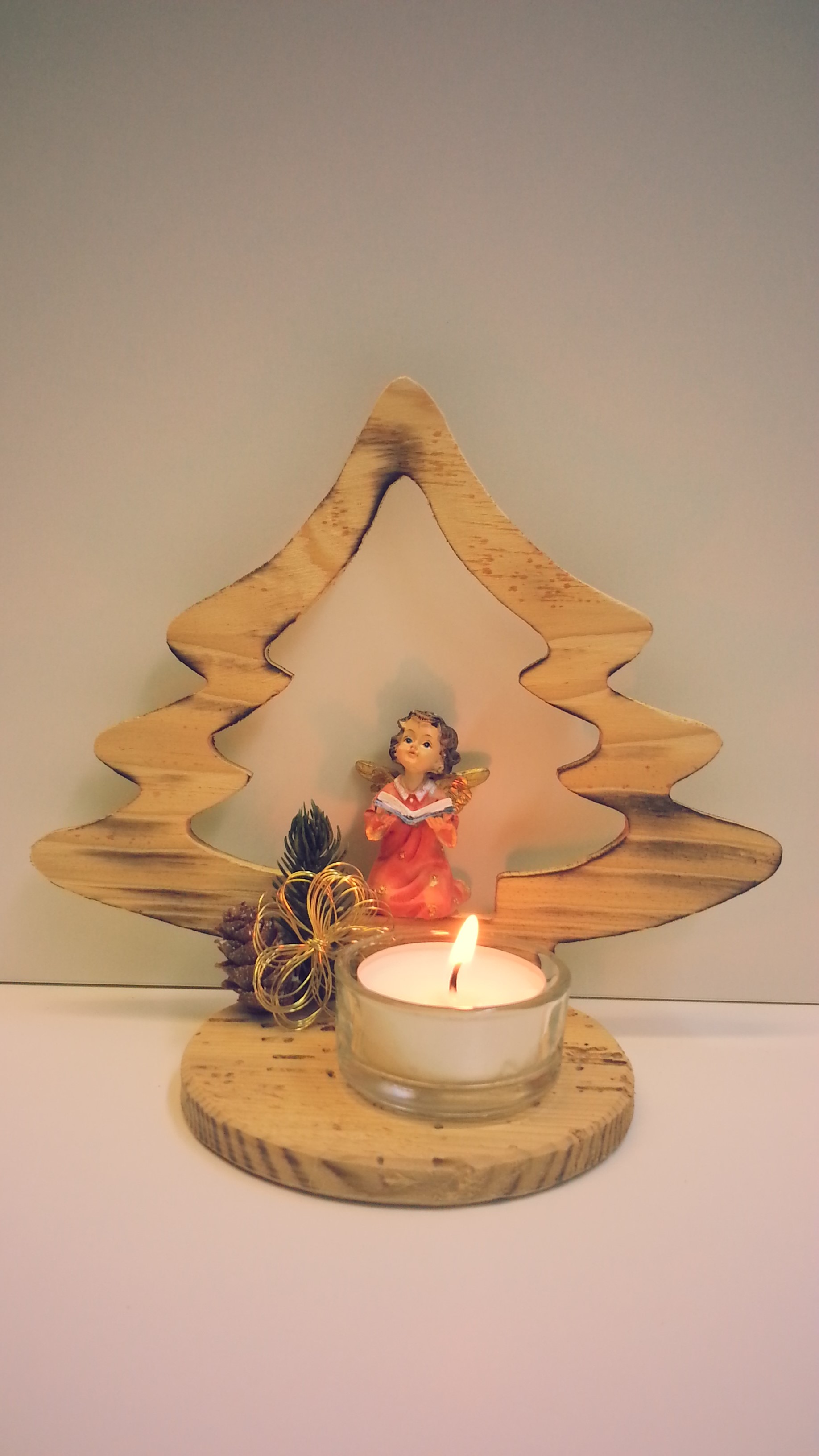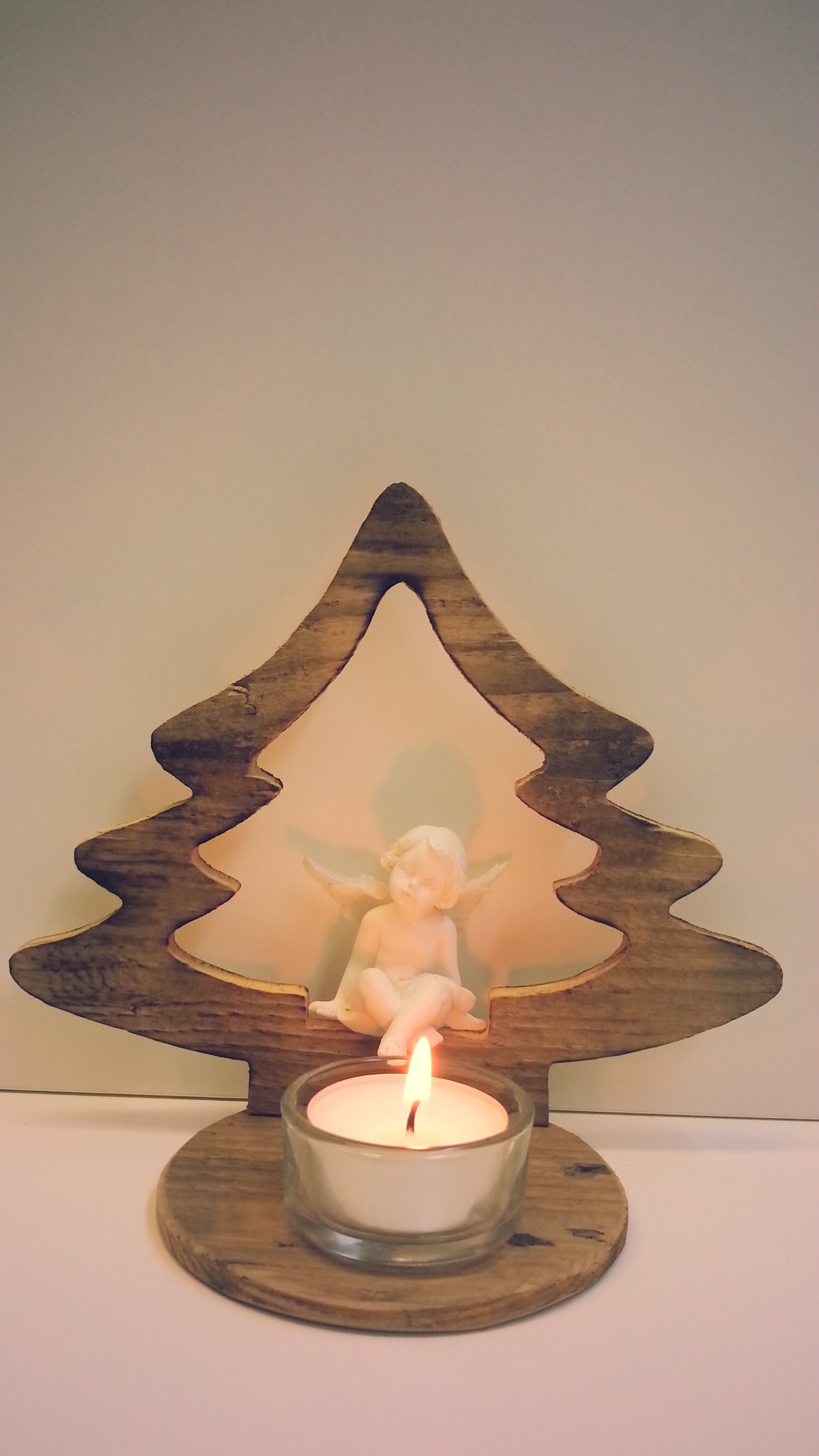 Teelichthalter mit dekorativen Tannenbaum und Altholzsockel