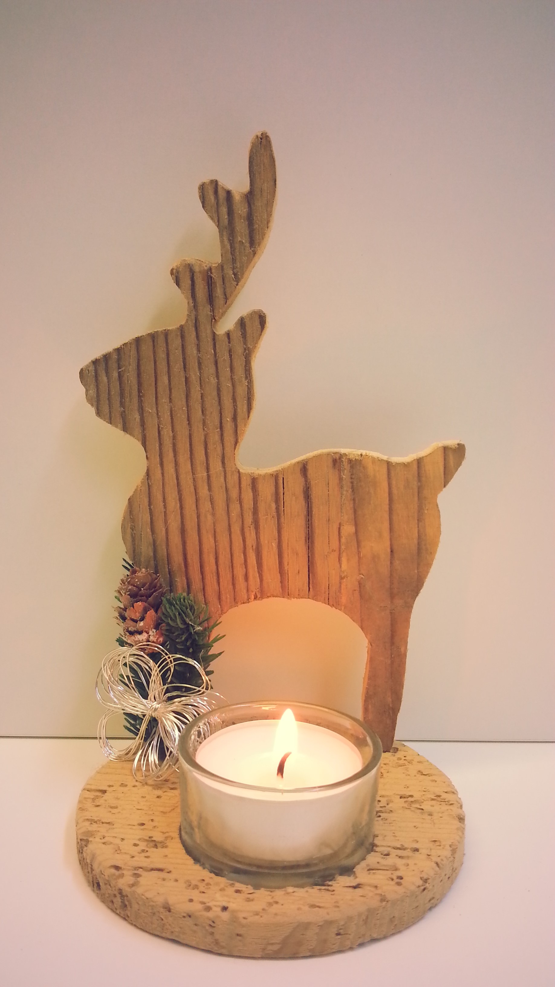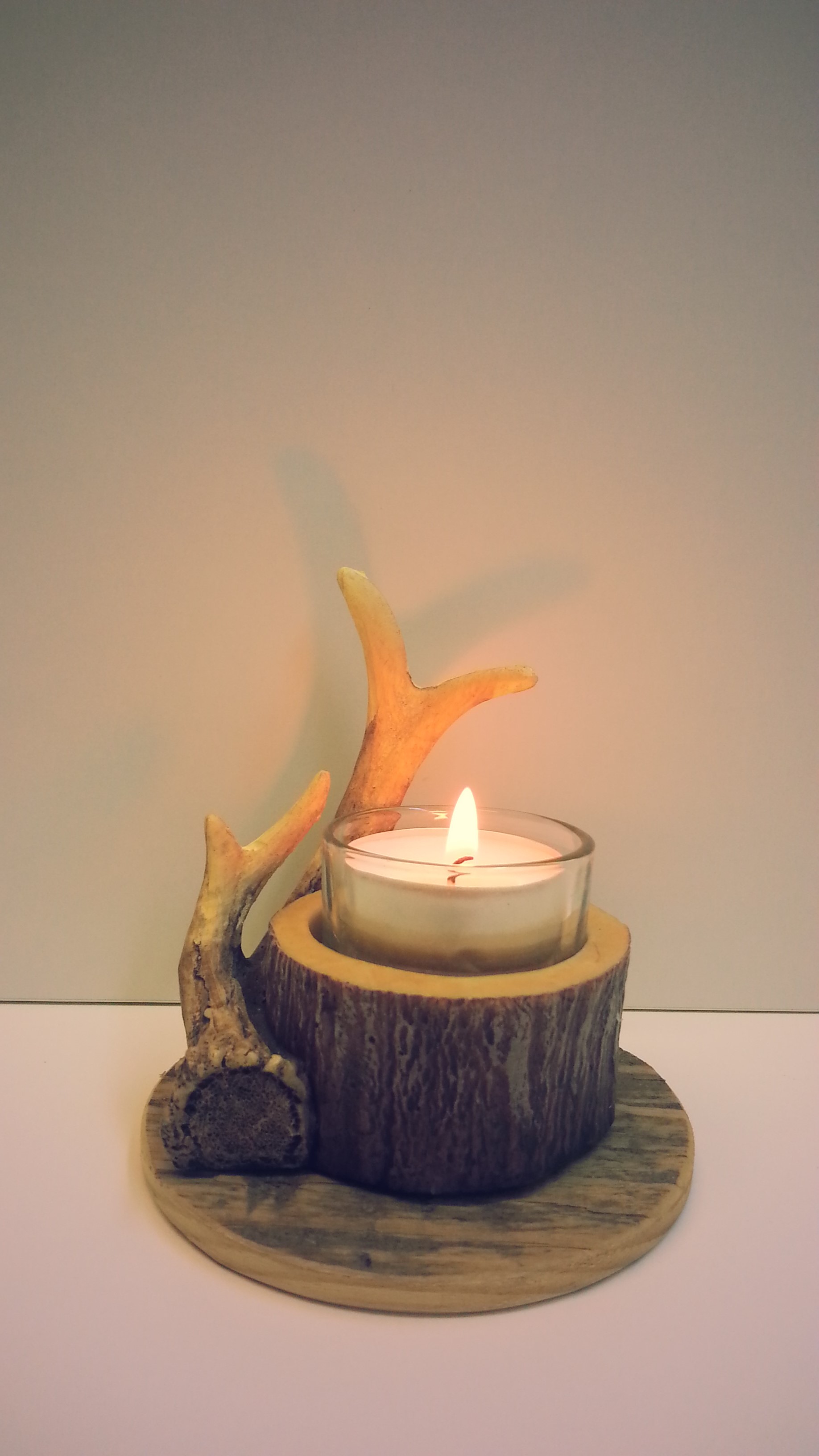 Teelichthalter aus Rehgeweihimitat auf Altholzsockel